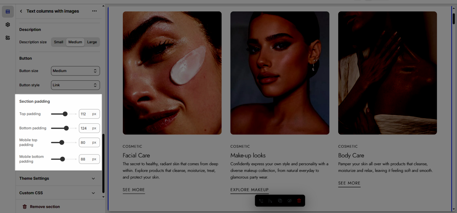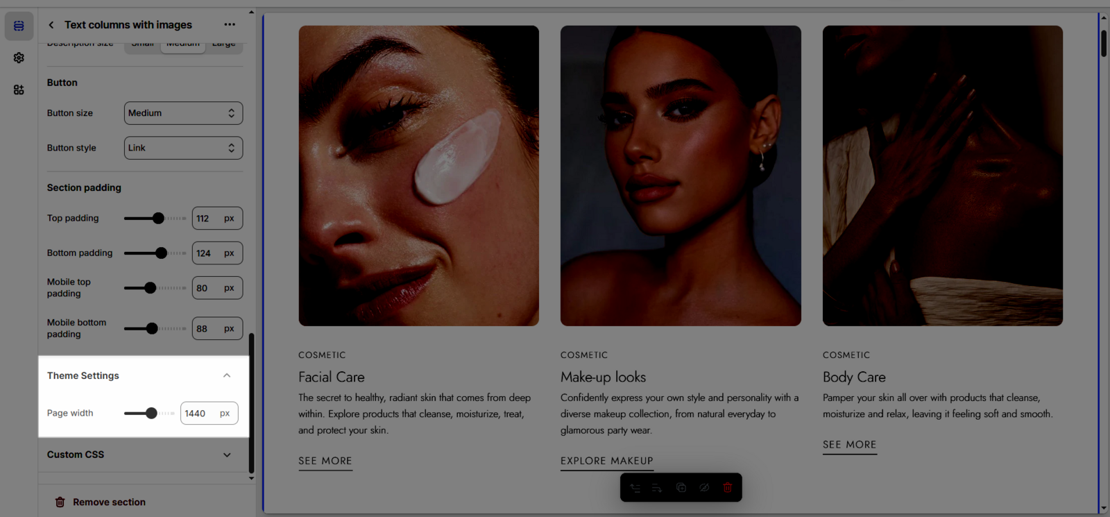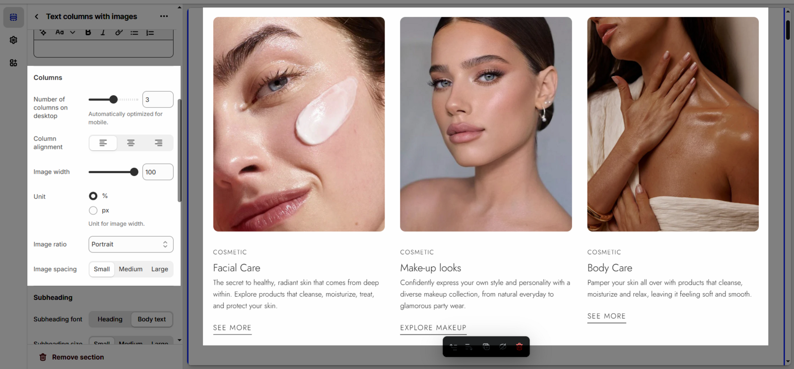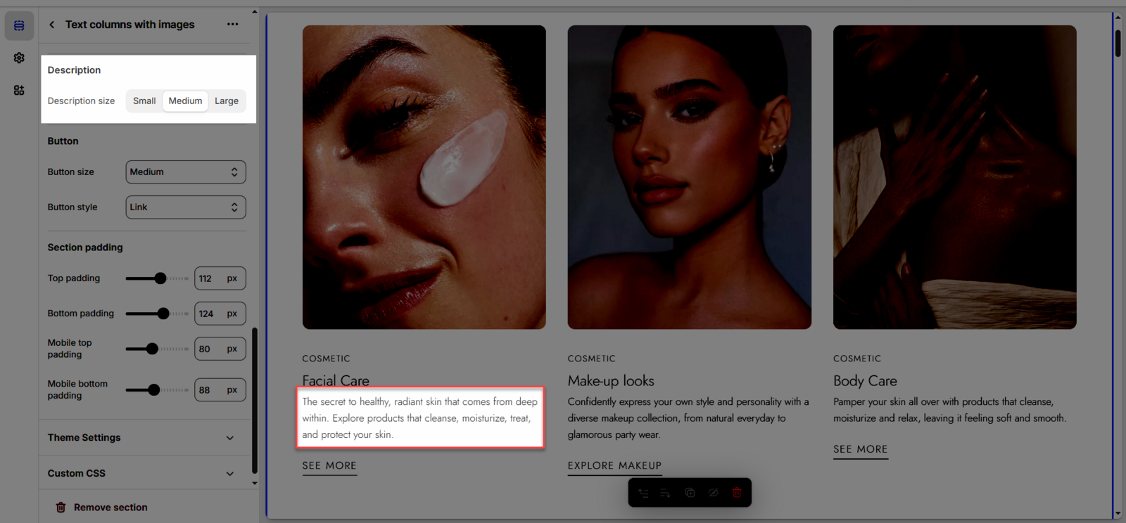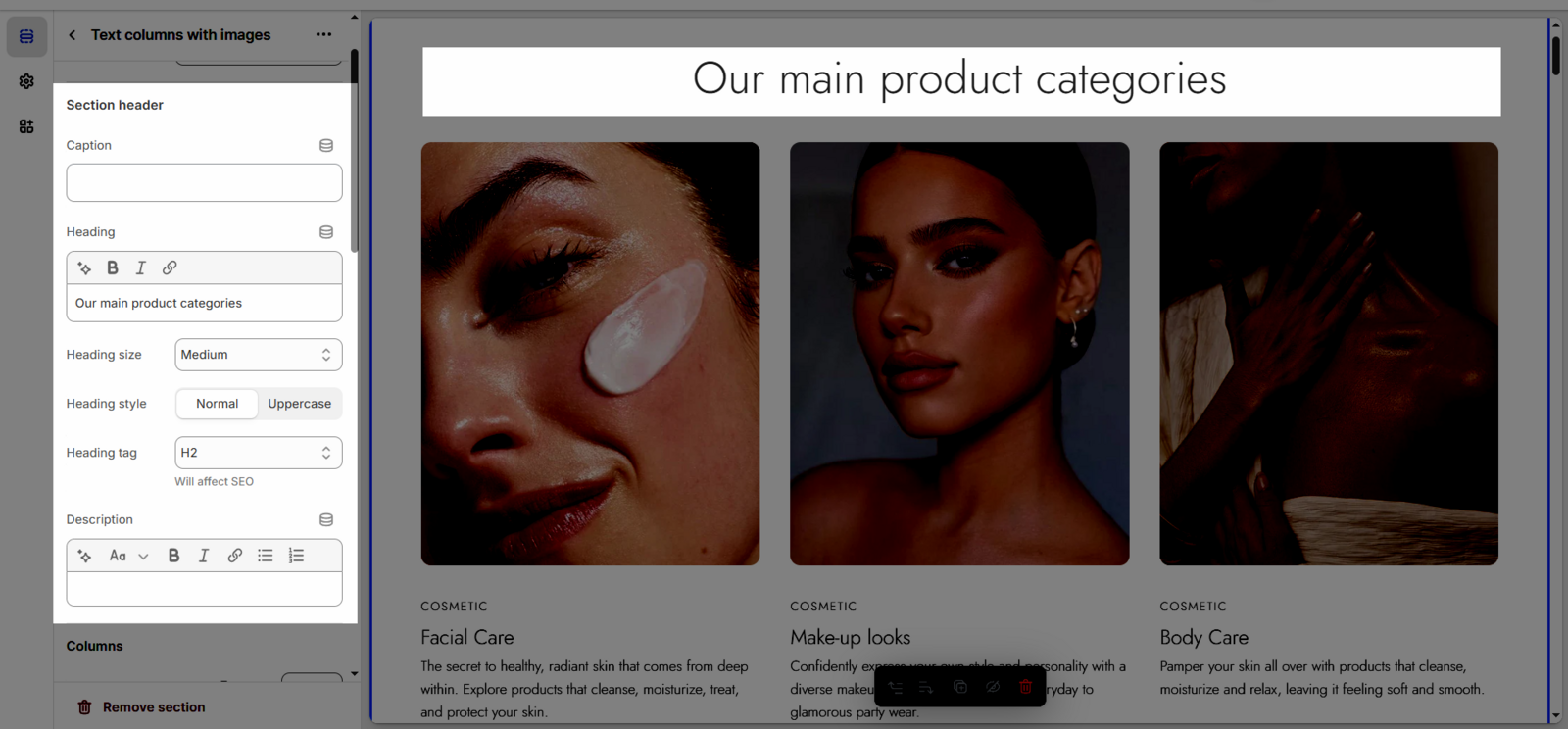 Once you add the Text columns with images section, you can customize its settings in the left or right sidebar (depending on your screen size)