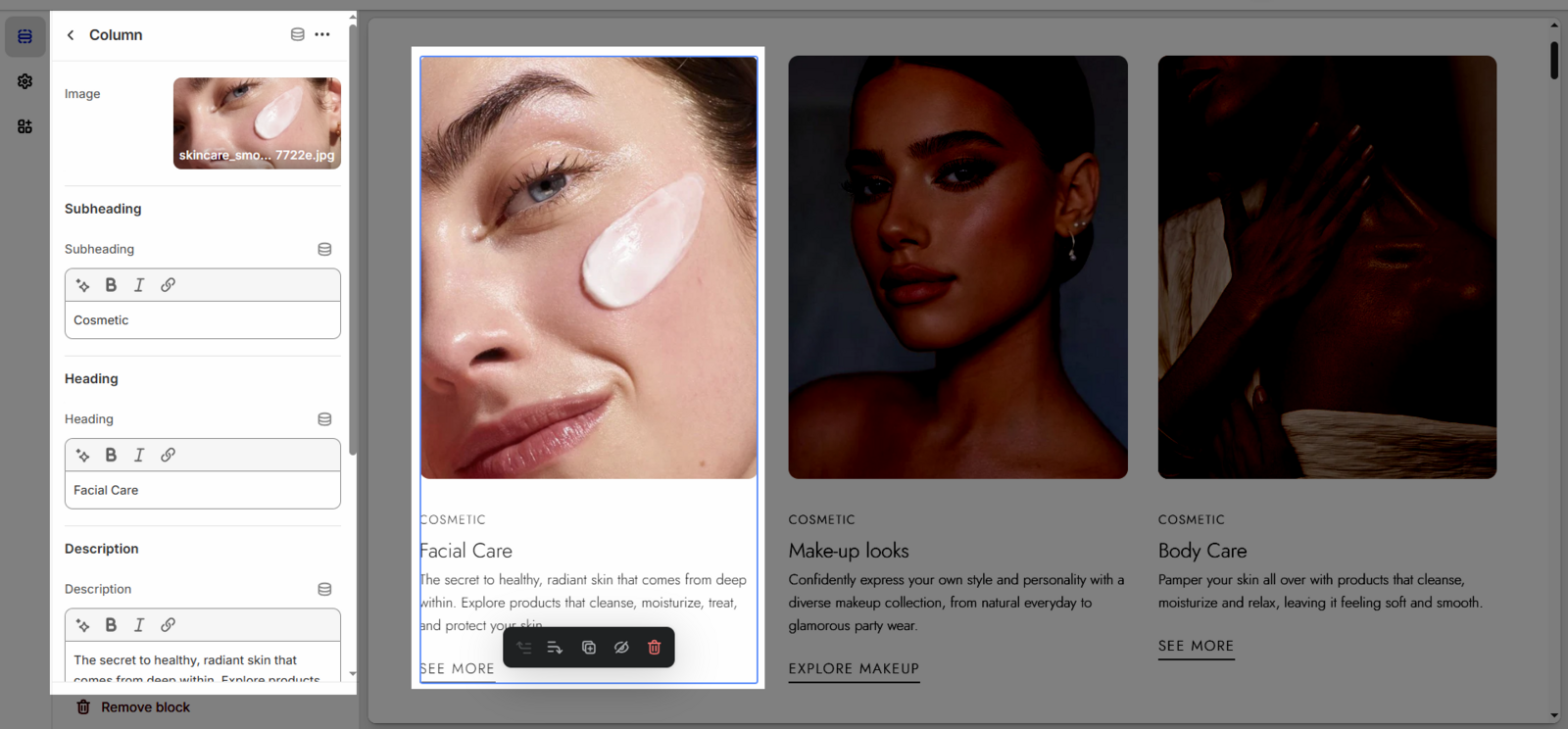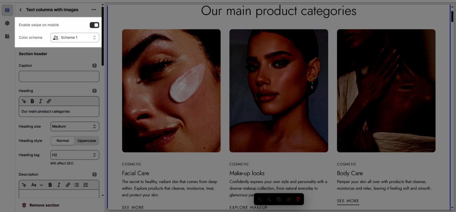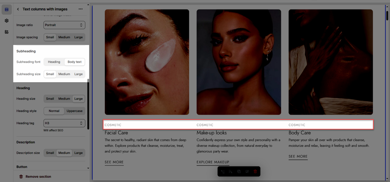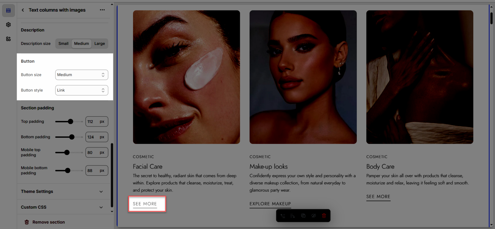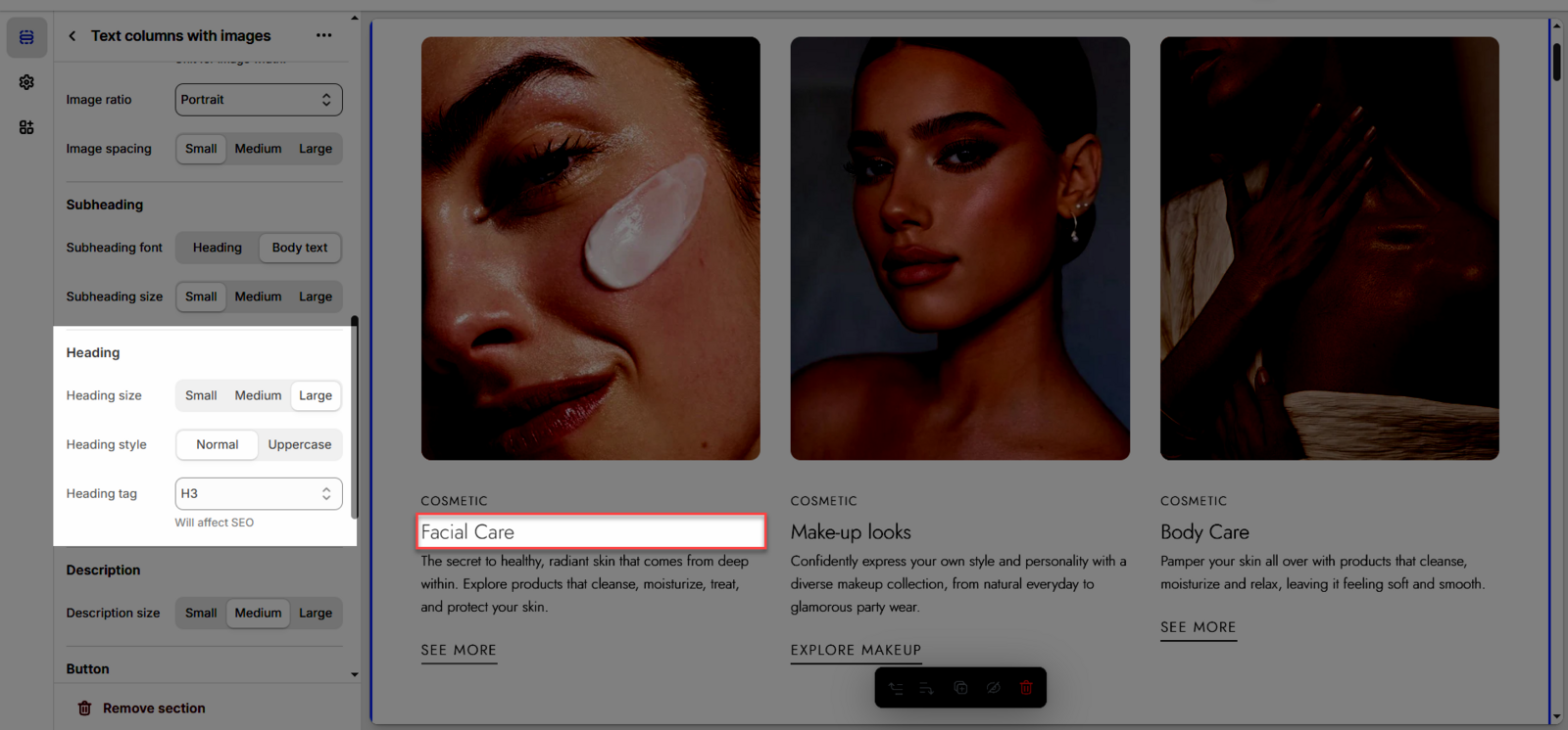 Once you add the Text columns with images section, you can customize its settings in the left or right sidebar (depending on your screen size)