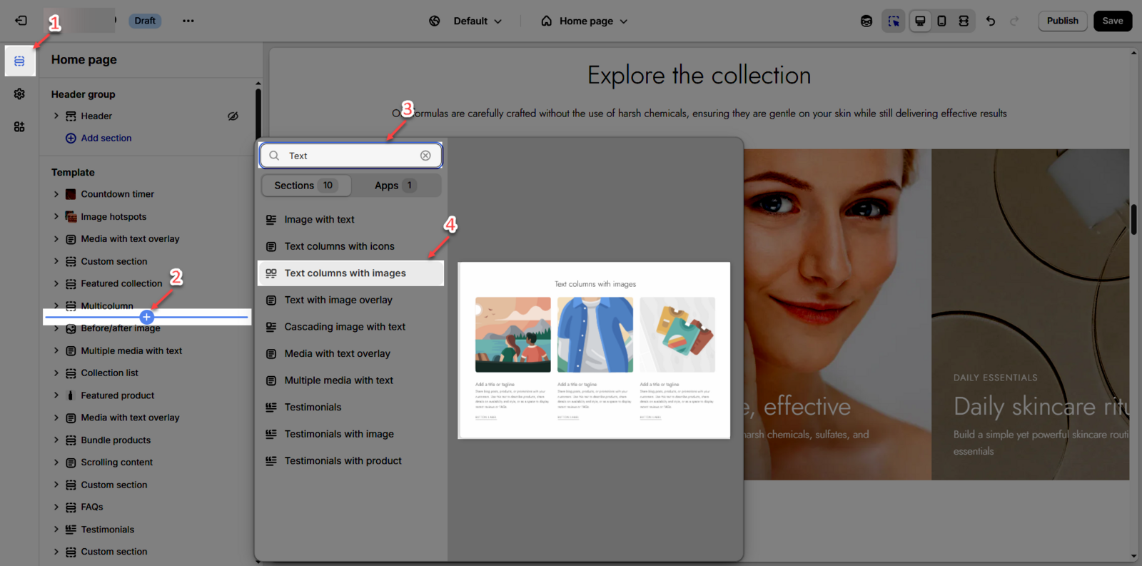 Step 02: In the theme editor (Customize), click the Sections button > Click the Add Section button or hover below another section until the (➕) icon appears > In the Sections tab, scroll through the list or use the search bar to find and select Text columns with images